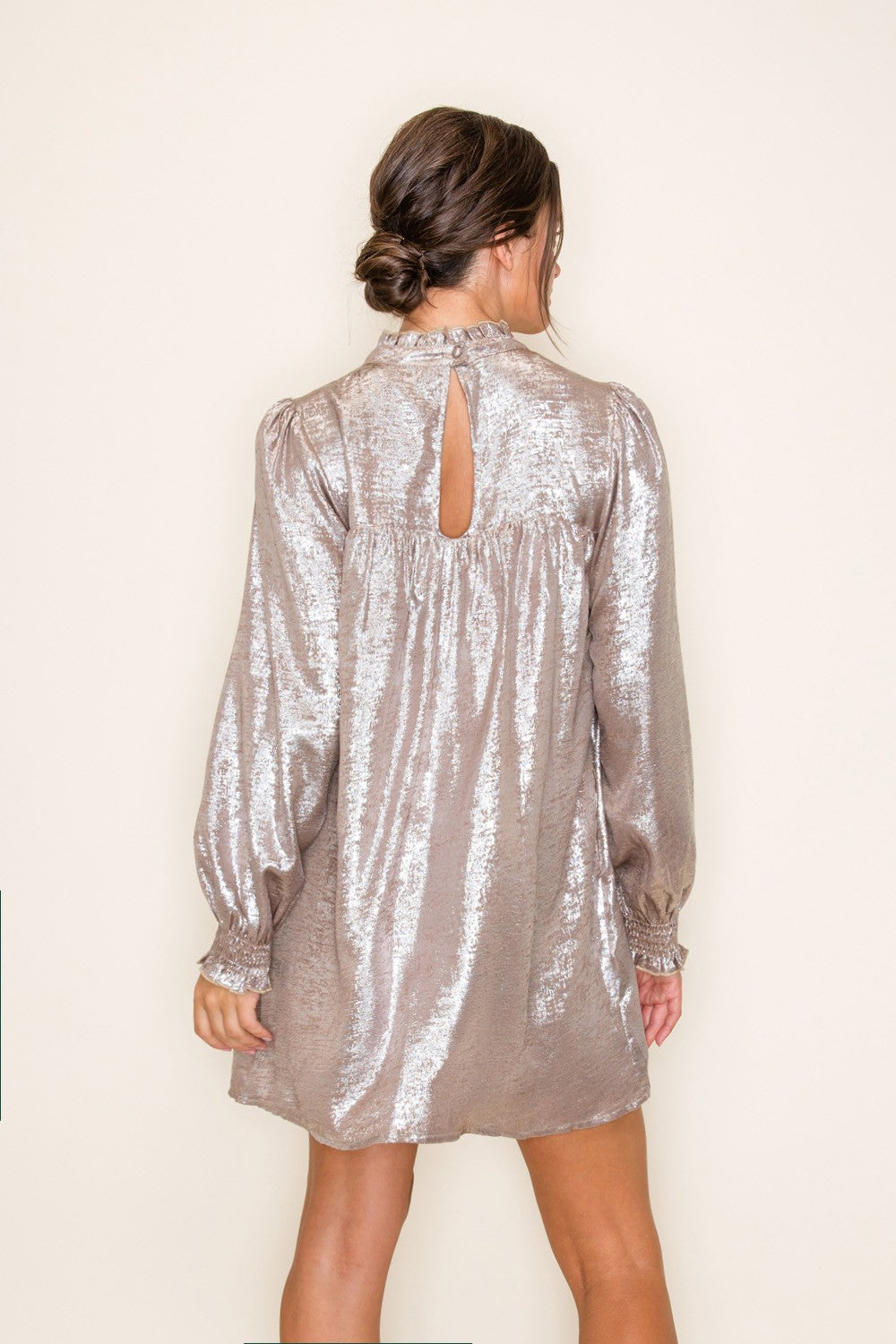 Metallic Foil Long Sleeve Smocking Neck Mini Dress
