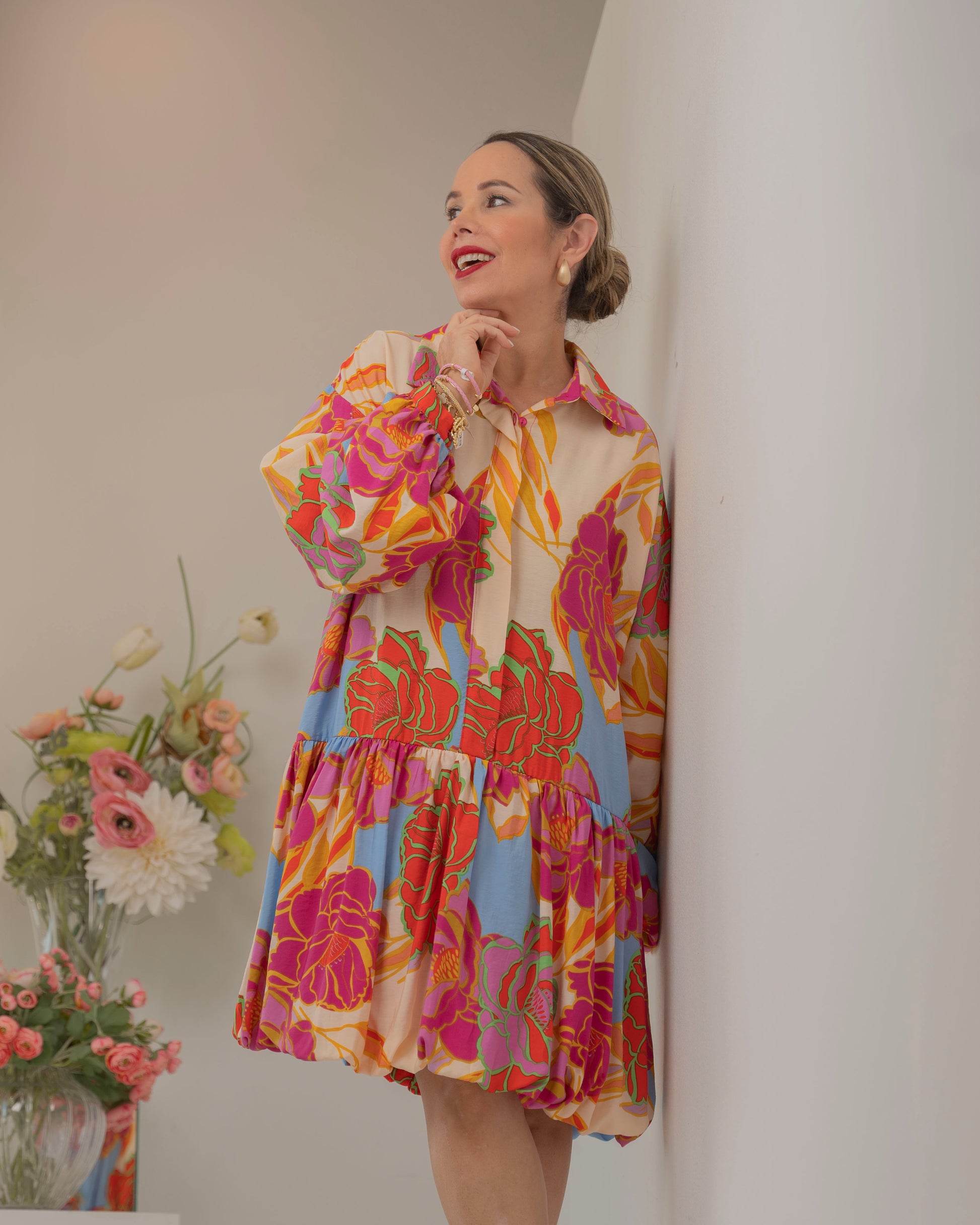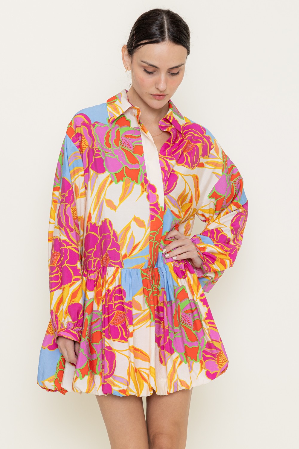 Floral Long Sleeve Bubble Skirt Mini Shirt Dress