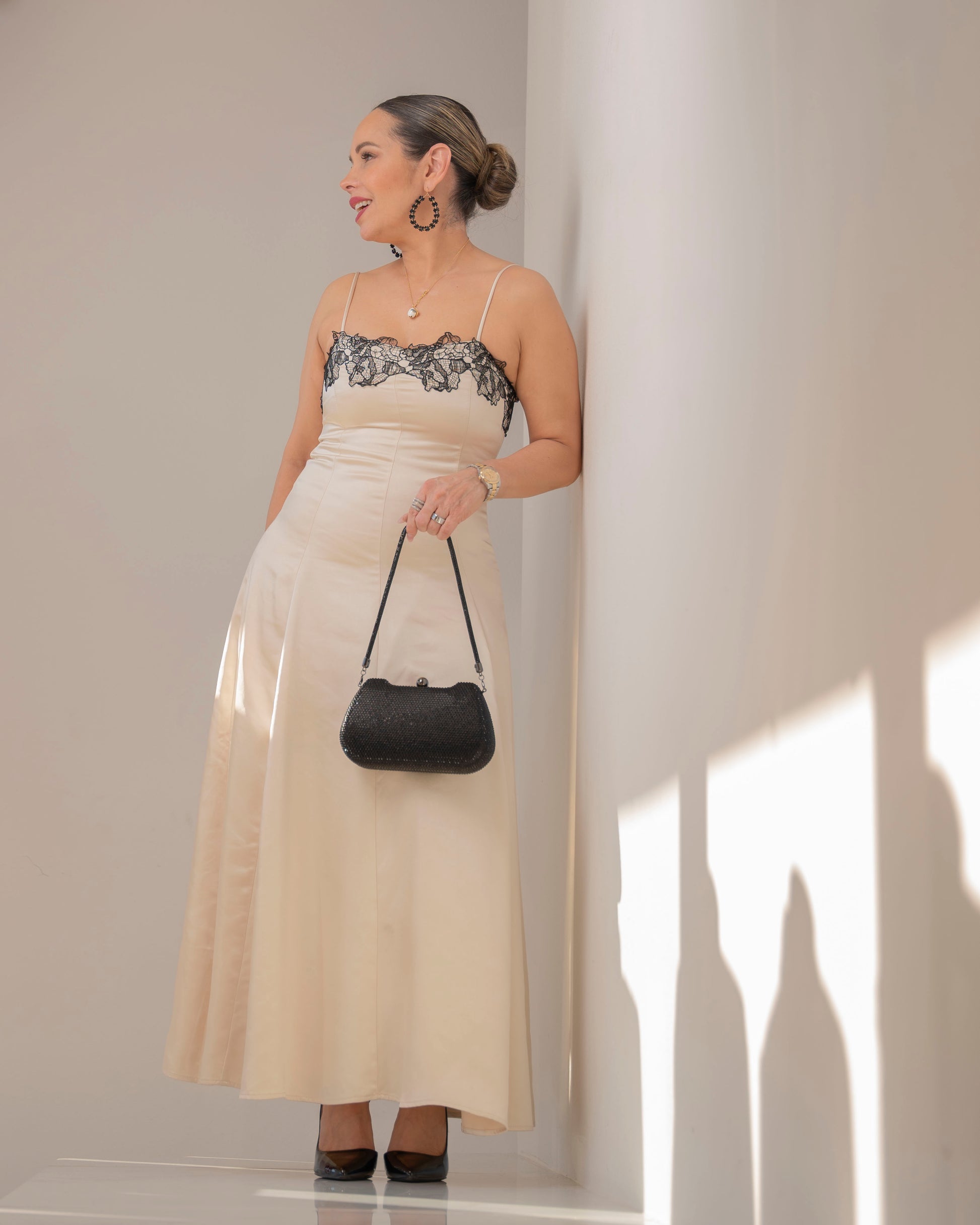Satin Black Floral Lace Bust Sleeveless Midi Dress
