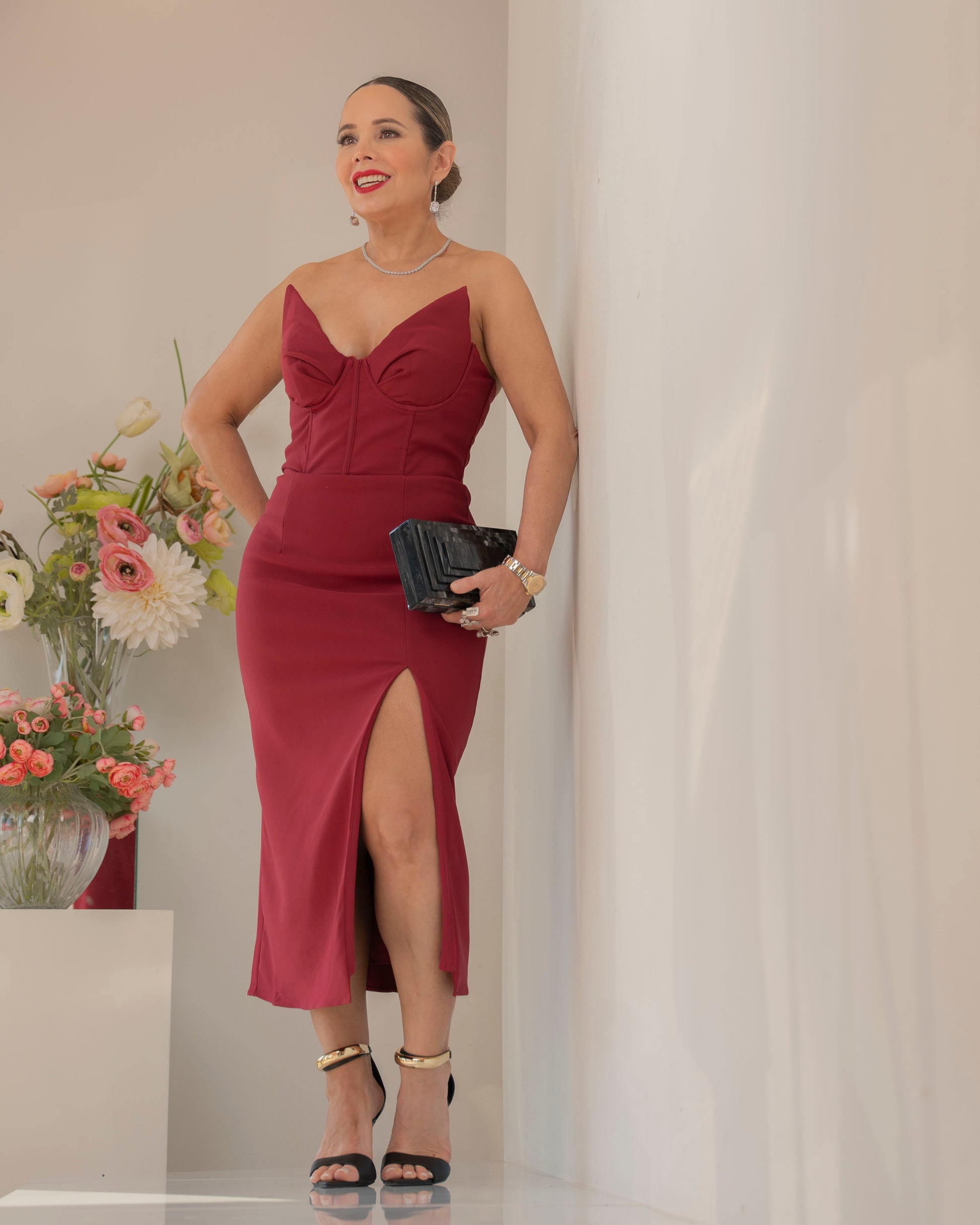 Sleeveless Bustier Top High Front Slit Midi Dress -Gold metal zip at back