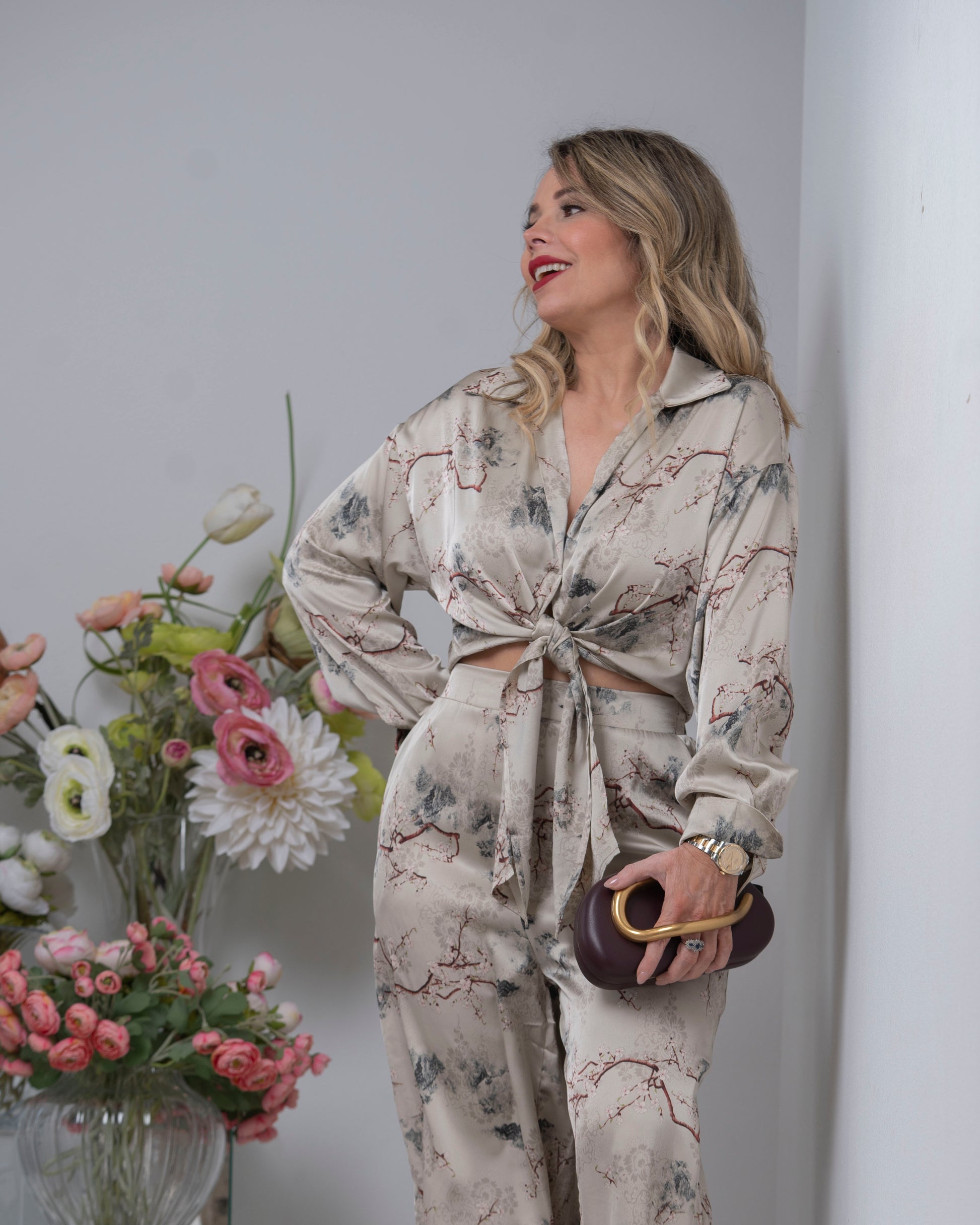 Long Sleeve Tie Front Waisted Top & Long Pants Set