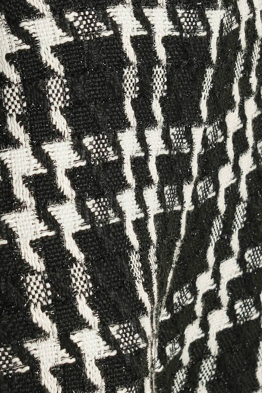 A ribbed knit top and tweed pant jumpsuit featuring mock neckline, short sleeve, side leg and back zipper closure