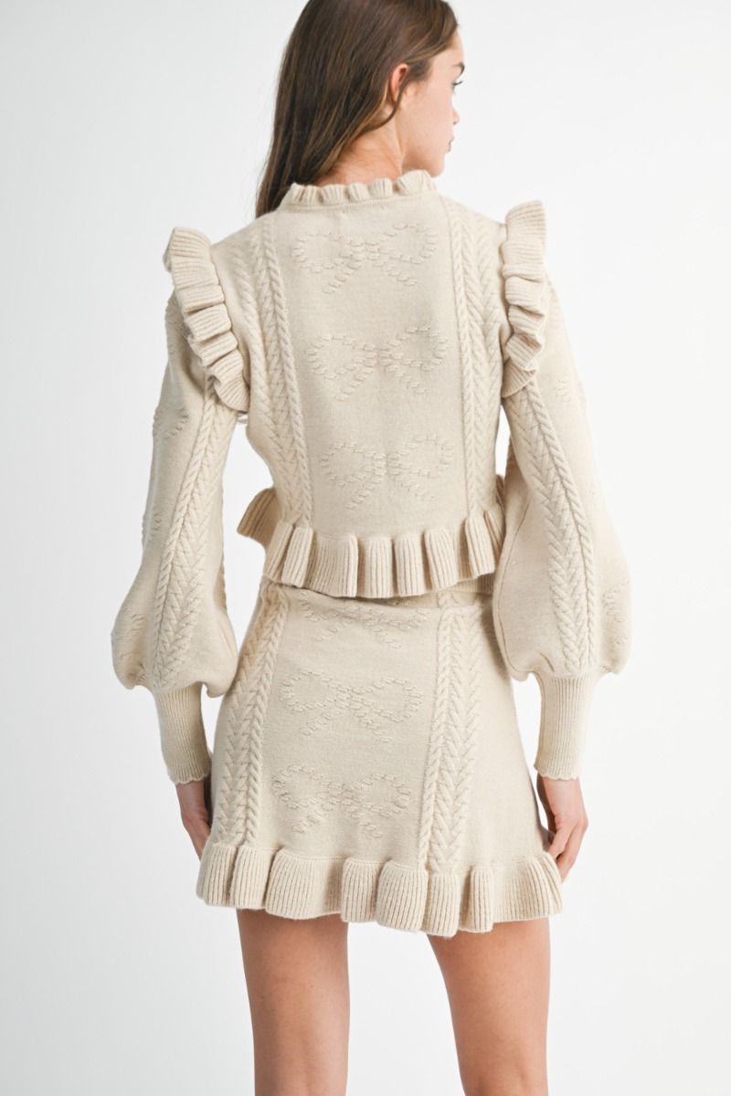 Long sleeve bow ribbon design knit ruffle peplum crop top and matching ruffle hem mini skirt set.