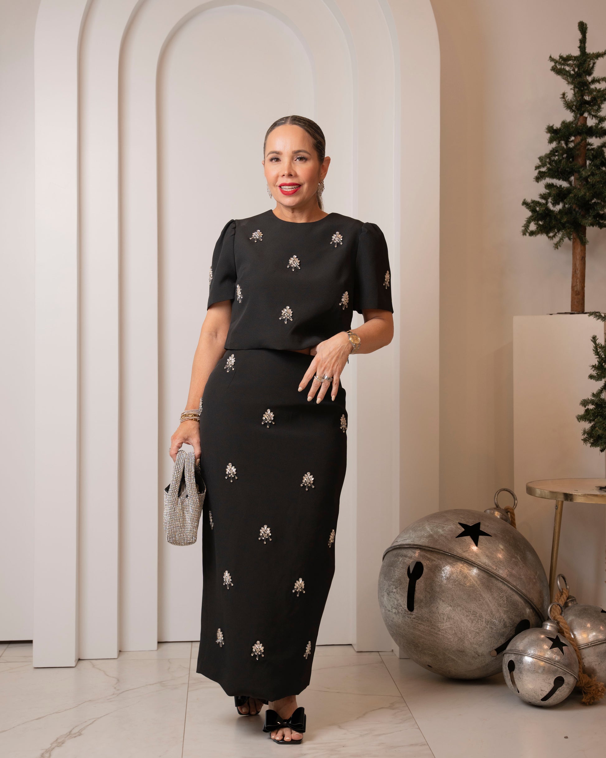 Jeweled embellished detail short sleeve cropped top and matching midi skirt set. Top has puff shoulder and back keyhole button closure and skirt has back invisible zipper.