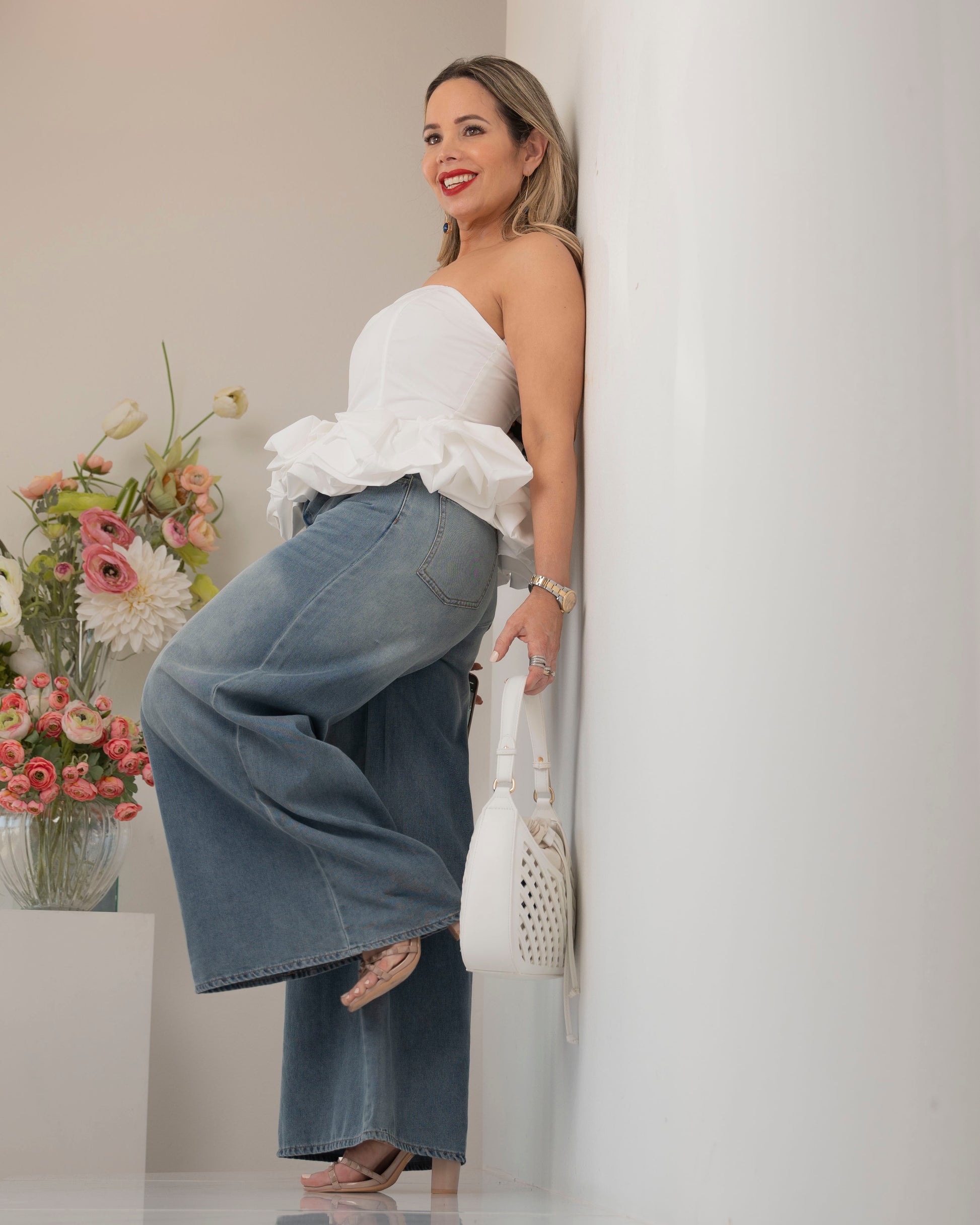 Strapless sweetheart bust crop top featuring ruffle hem. Smocking and zipper closure at back. Unlined. Woven. Non-sheer. Lightweight.