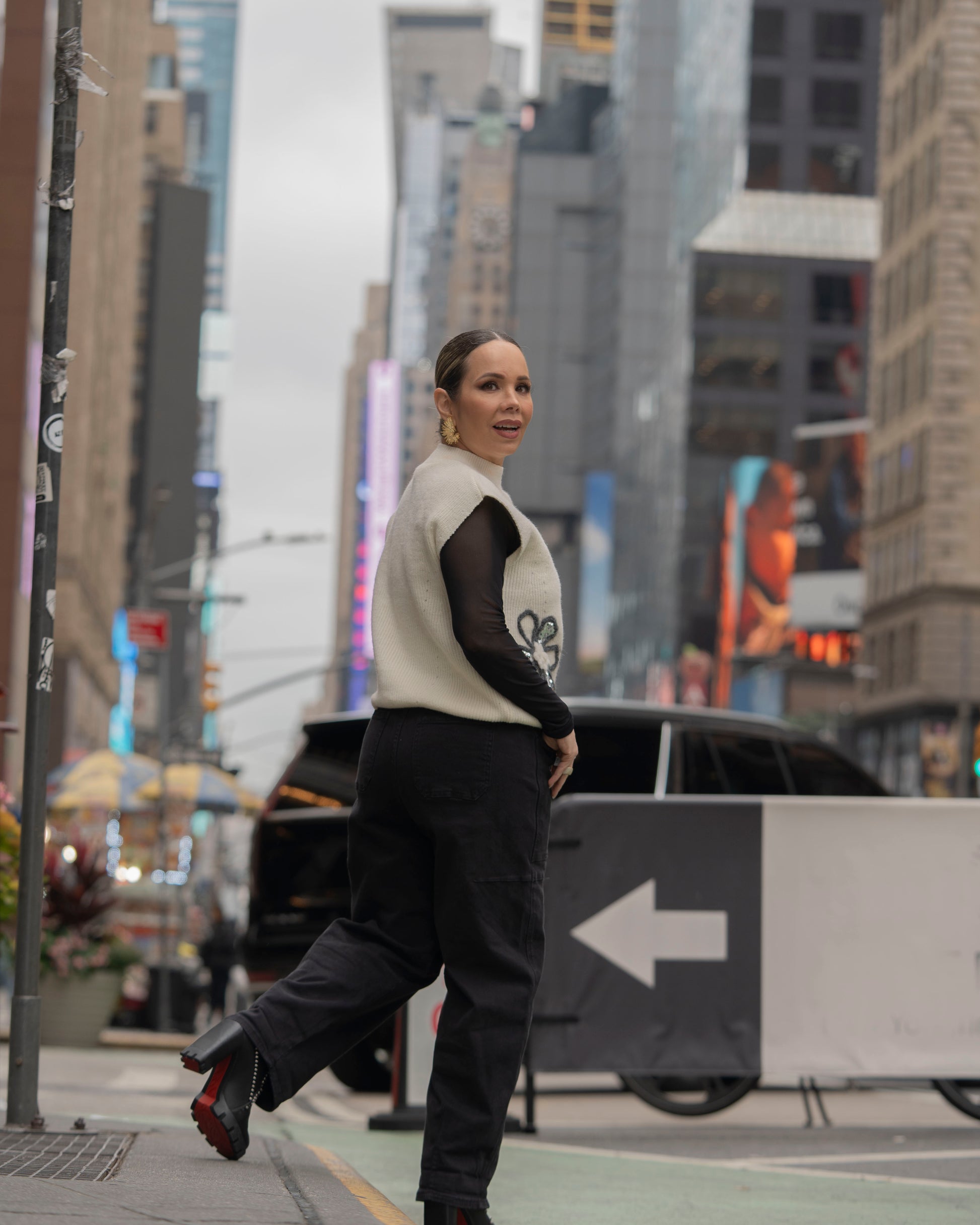 Solid mock neck cap sleeve knit sweater top featuring floral applique. Scallop hem. Unlined. Knit. Non-sheer. Lightweight