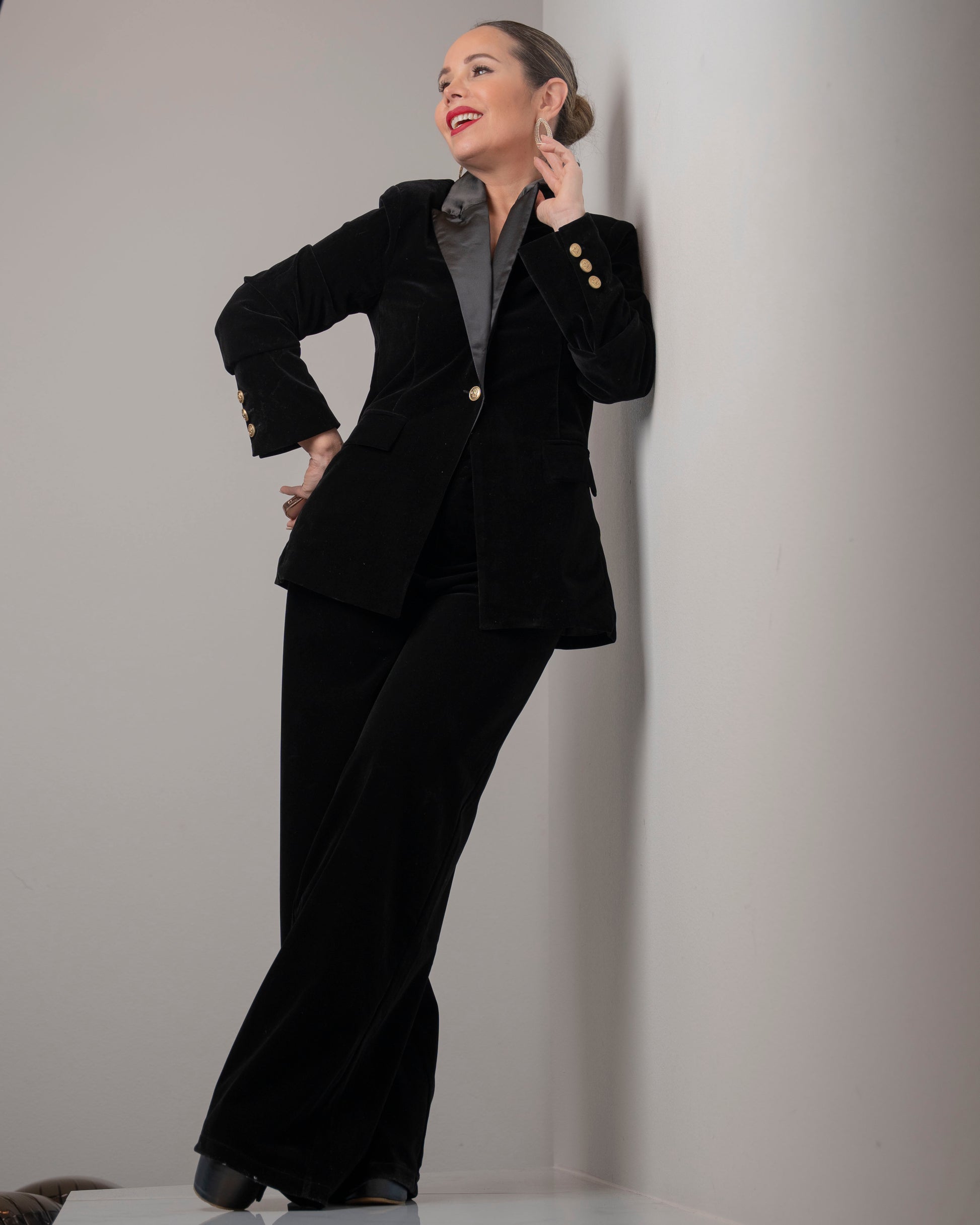 A bonded woven velvet blazer with satin collar and front single button closure.