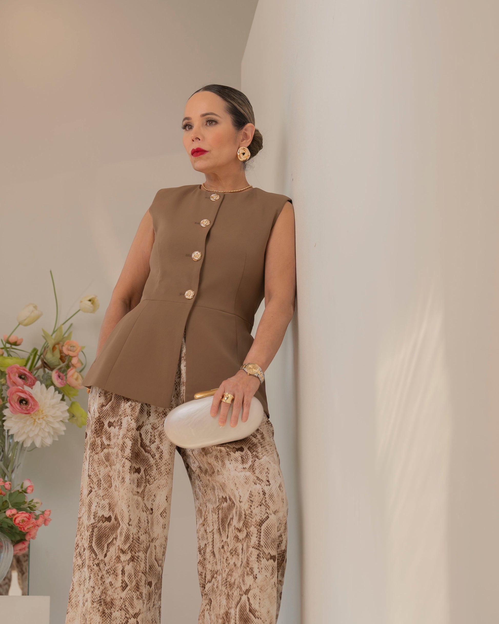 Solid tailor-inspired structured shoulder sleeveless vest top featuring accented gold front button closure. Pockets at side. Lined. Woven. Non-sheer. Lightweight.